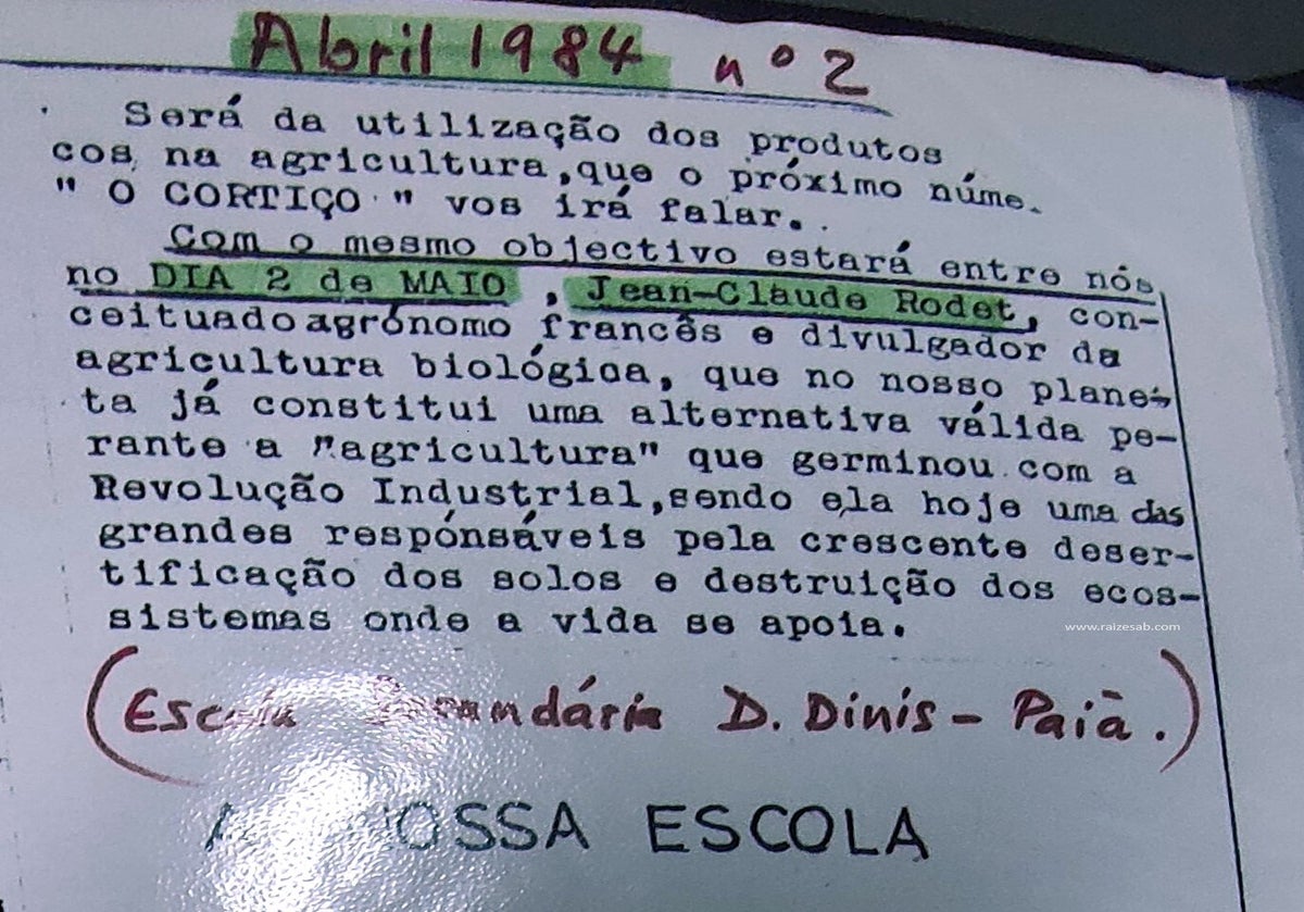 Pela mão de Luís Fiipe C. Marques e João Santos (alunos na Escola da Paiã) Rodet é convidado para uma palestra em Lisboa, mas em vez da realização de um evento falado inicialmente, houve a programação de 4 sessões, a primeira a 2 de Maio, para os alunos e professores da Escola da Paiã. Esta palestra foi noticiada no Boletim da Escola “O Cortiço” enquadrada por uma excerto do livro de Claude Aubert “A Industrialização da Agricultura, Salvação ou Suicídio da Humanidade?”.